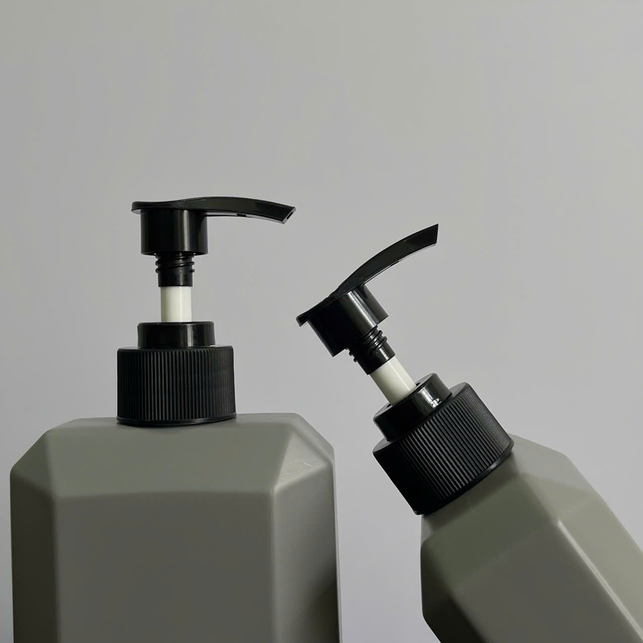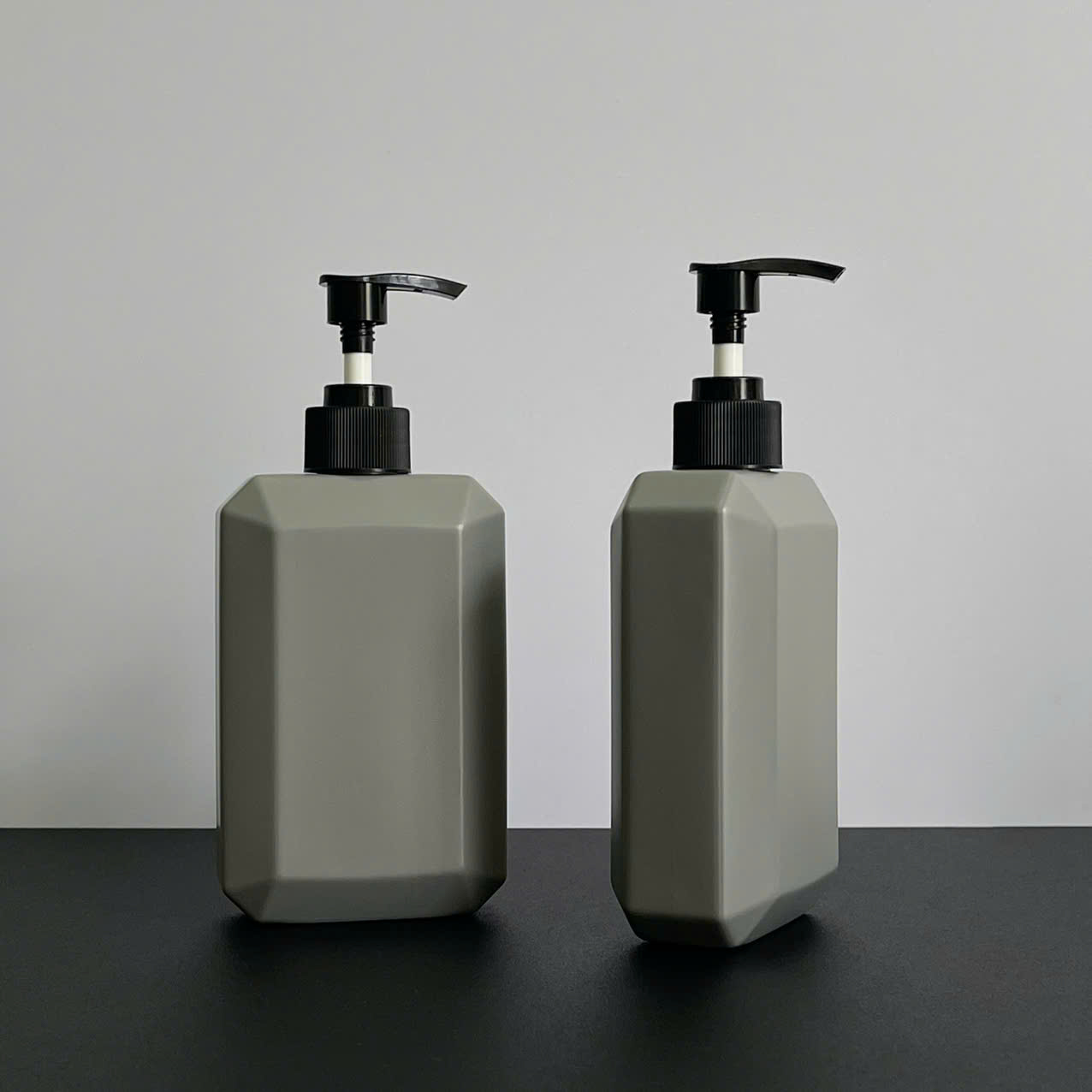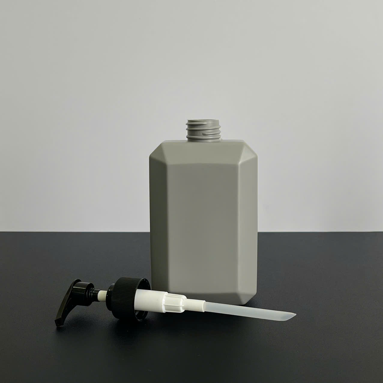 Chai nhựa HDPE vuông xám với vòi nhấn sóng sọc đen 350ml sử dụng dụng vòi fi28 – Bao bì hiện đại, gọn gàng cho mỹ phẩm và dung dịch chăm sóc cá nhân