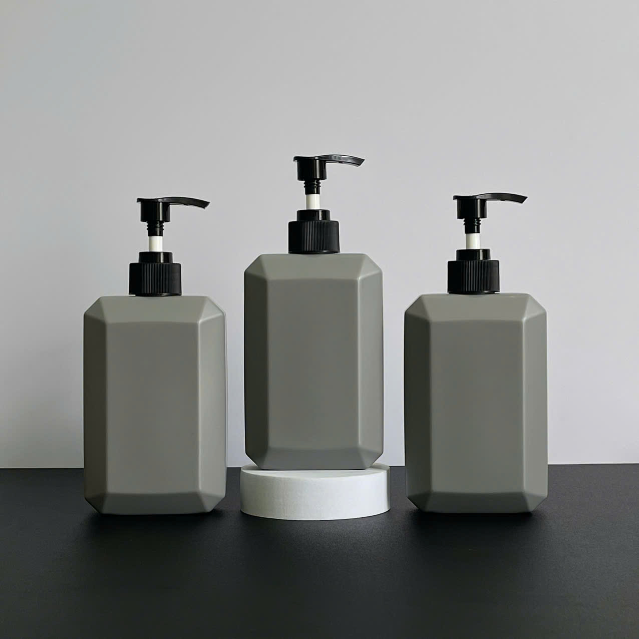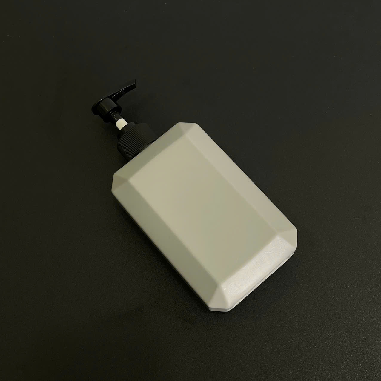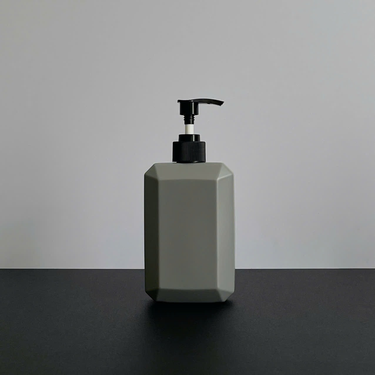 Chai nhựa HDPE vuông xám với vòi nhấn sóng sọc đen 350ml sử dụng dụng vòi fi28 – Bao bì hiện đại, gọn gàng cho mỹ phẩm và dung dịch chăm sóc cá nhân