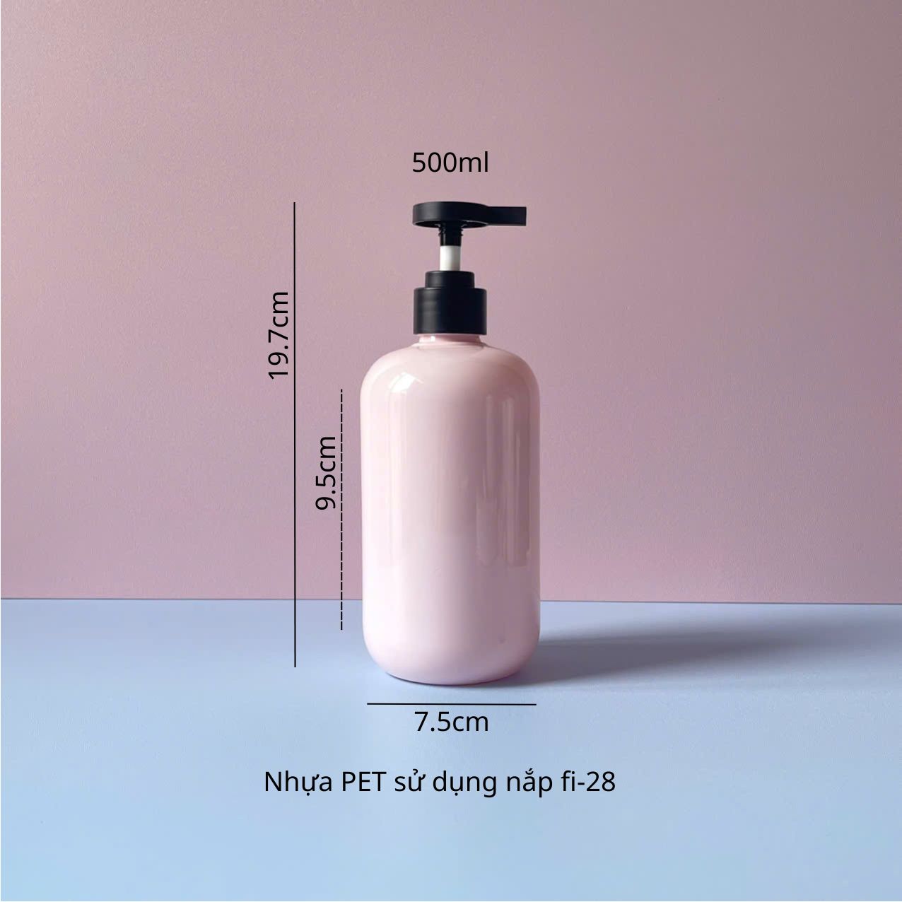Chai nhựa PET hồng 500ml với vòi nhấn dẹp đen nhám sử dụng vòi fi28 tiện lợi – Thiết kế tinh tế, chất liệu bền bỉ cho bao bì mỹ phẩm chuyên nghiệp